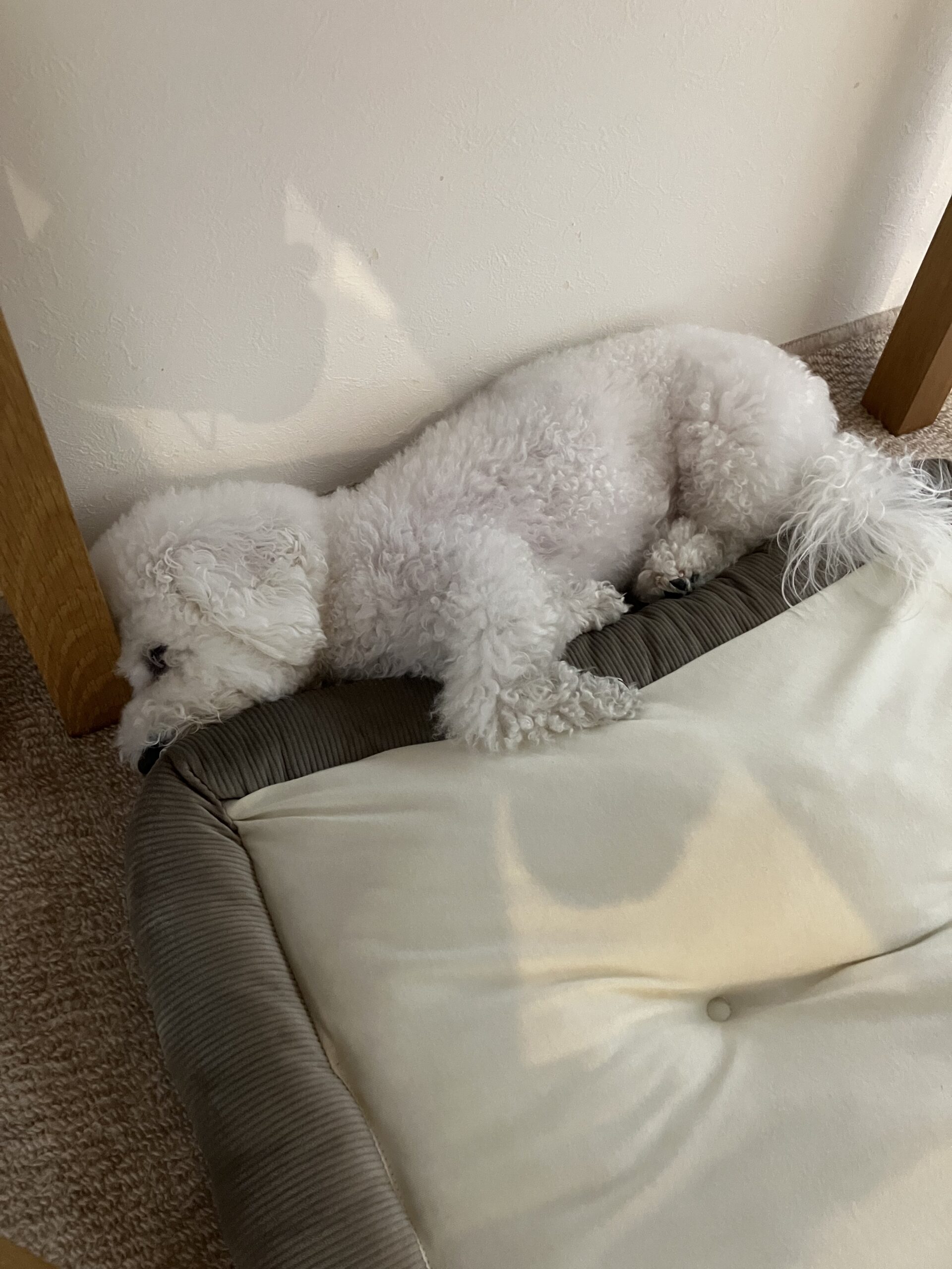 パパもママもちょっとショックでした。ビションフリーゼなので、体は毛でもふもふしているので、やせ過ぎなのがわかってあげられなかったかな。おなからへんはスリムなのかも。
